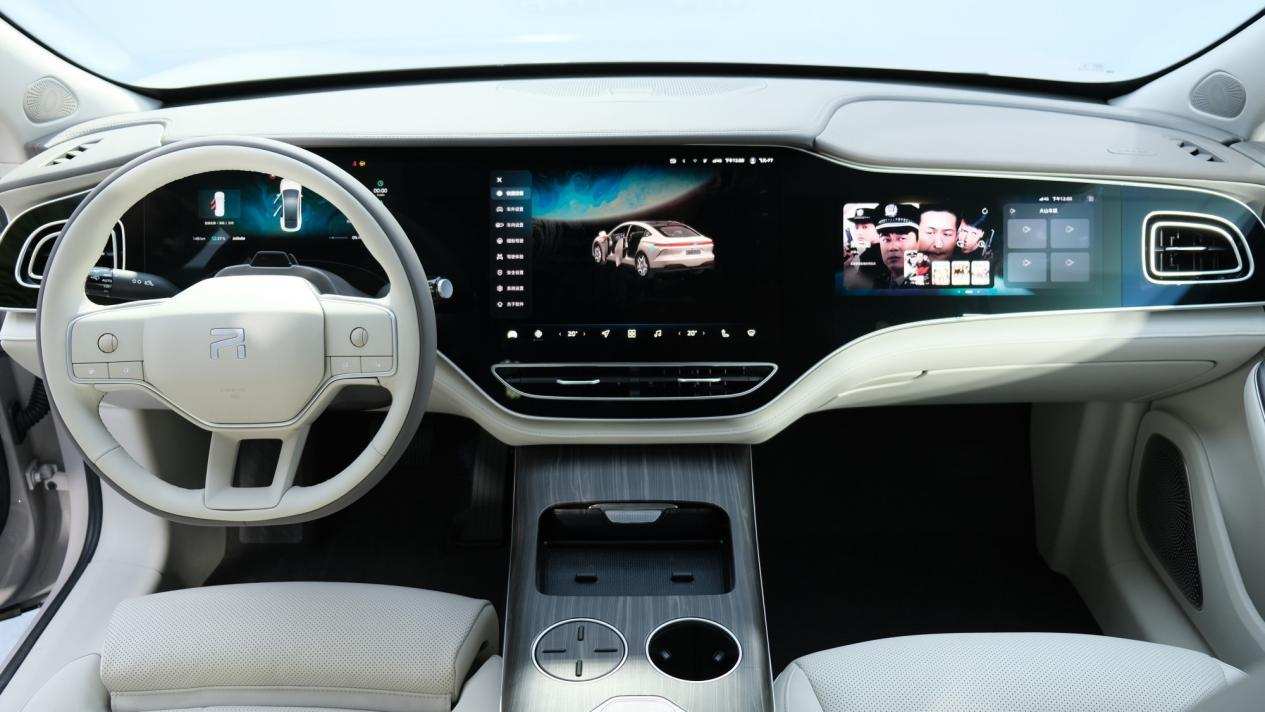 内饰方面,新车和飞凡R7如出一辙,同享『屏霸』头衔。三联屏由10.25英寸全液晶仪表、15.05英寸OLED中控屏以及12.3英寸副驾娱乐屏组成,OLED的显示屏展示出了相当细腻的清晰度和艳丽的色彩饱和度。