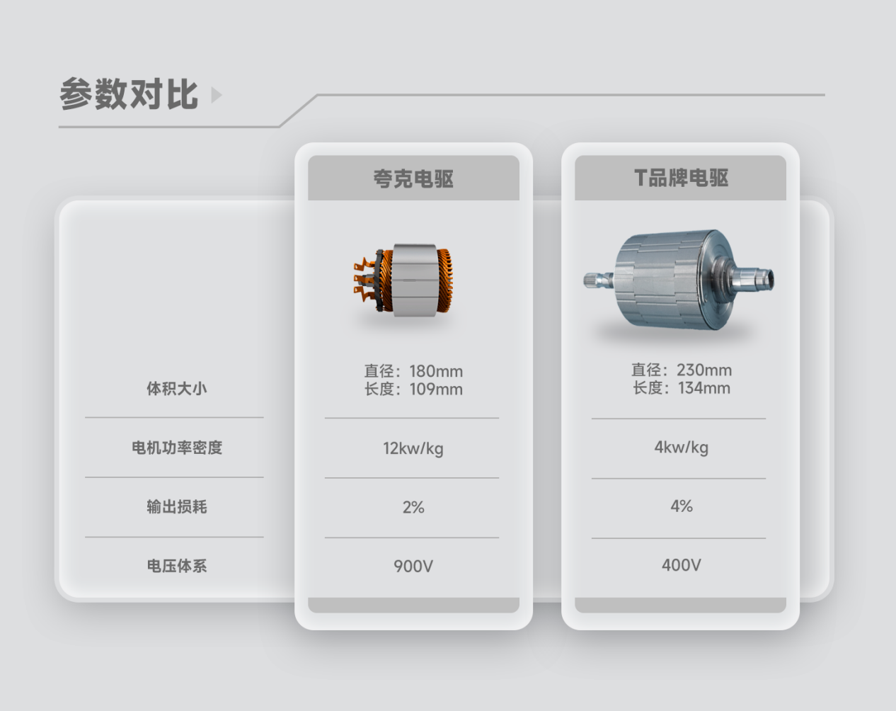 在与主流对手的对比中,夸克电驱在尺寸、功率密度、输出损耗等方面的参数均有优势。