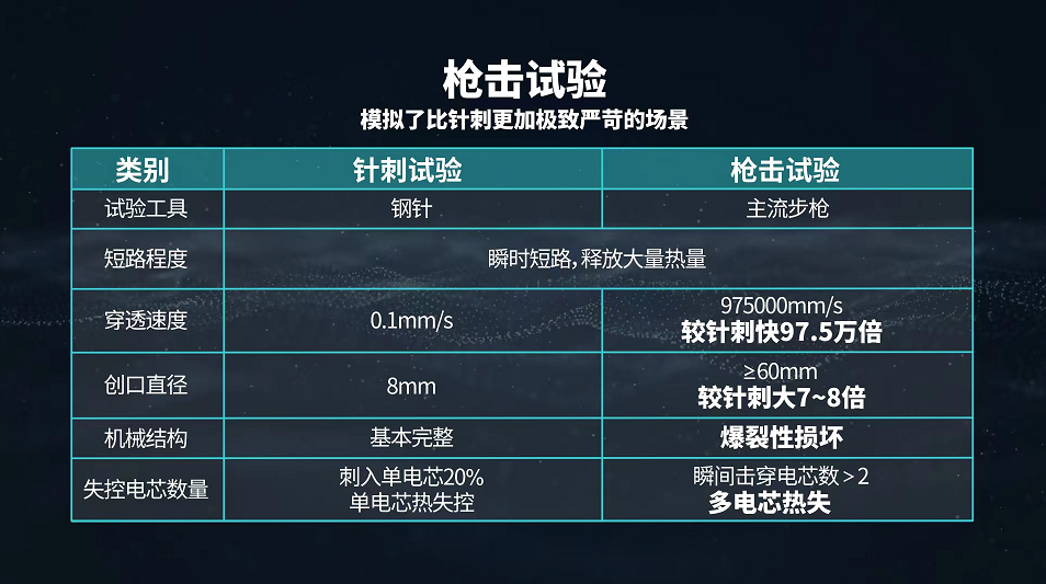 这次的枪击试验可以理解为目前动力电池破坏性试验的天花板。从难度进程来看是从冷兵器到热兵器的进阶,是静态破坏到动态破坏的升级。要我说,除了拍电影,这样的试验场景在国内几乎不会出现,埃安这次的试验不仅验证了弹匣电池2.0的稳定性,也给我们吃下了一颗定心丸,同时也给友商们带来了新的挑战,我干了,你不干吗?