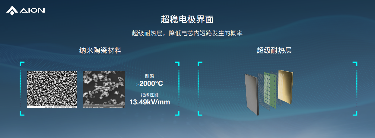 首先,这款电池在电极界面引入了最具稳定性和耐热性的纳米陶瓷材料,这种超级隔热层能够大幅增加电极界面的韧性,在这种材料的加成下,就算电芯失控,温升速率也会快速降低。这算是这款电池的第一重保障。