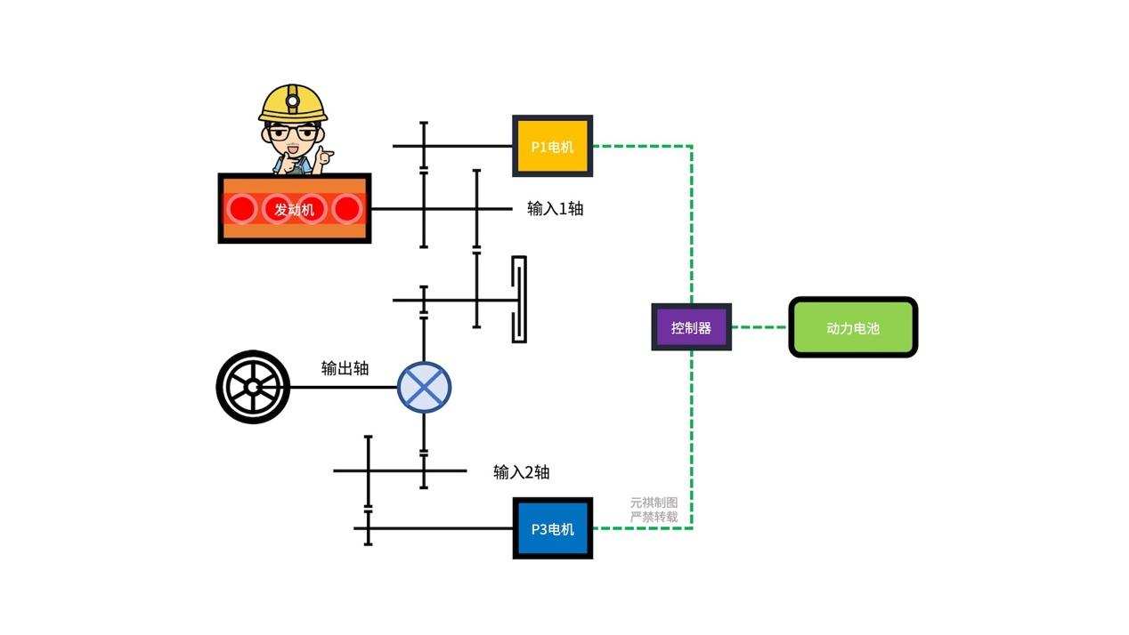 在两个动力源同时输出时,「输入1轴」和「输入2轴」上的功率汇总在「输出轴」最终到达轮端。整体来说,动能的流向同样也是「二入一出」十分的清晰明了。
