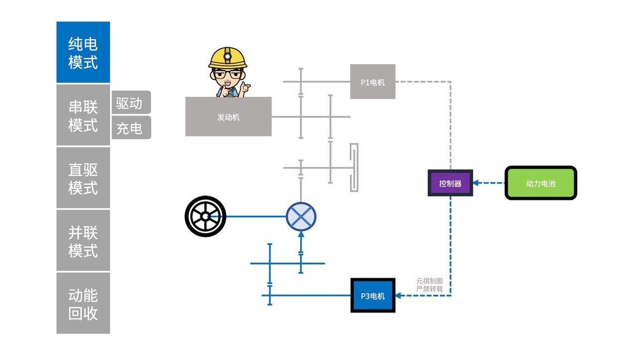当发动汽车时,「P3电机」从「电池组」中获取电能,直接驱动汽车开始行驶,「P3电机」在低速下能提供较大的扭矩,而且噪音小,没有发动机那样的抖动。当我驶出公司所在的园区后,「P3电机」的功率随着我对动力的需求增大而不断提升。此时,处于纯电驱动模式。