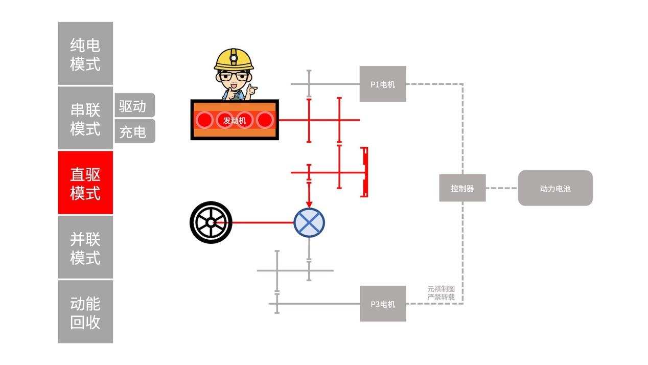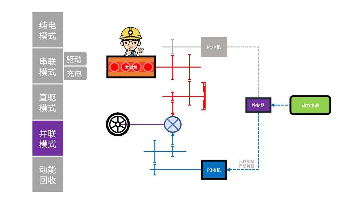 此时,前方出现了一辆速度较慢的货车,我想在高速巡航的情况下,进一步提速,所以深踩加速踏板,系统则会检测到动力需求还在提升,并可能会让「发动机」脱离最佳的工作区域,故此,系统会让「电池」给「P3电机」供电,进入全动力源输出的并联模式。