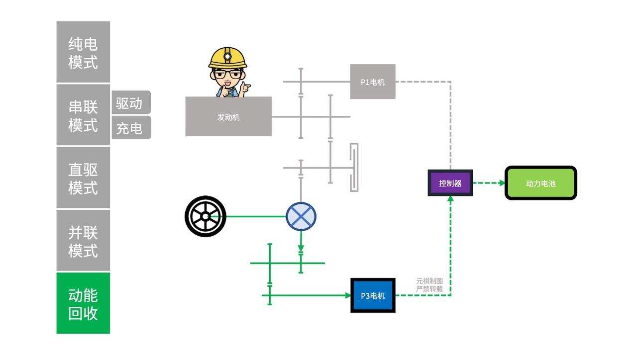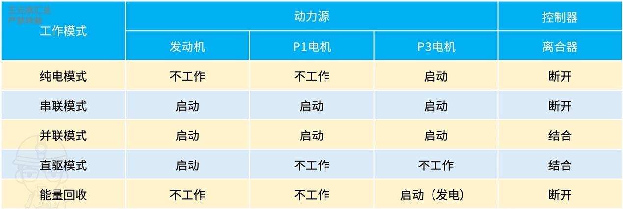 「五菱DHT」同样以纯电模式、串联模式、发动机直驱模式和并联模式和能量回收,这5种模式为主。根据上面官方给出的工作模式对应工况的解释,我们展开分析一下:
