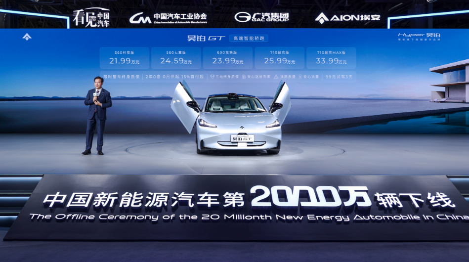 工信部和中汽协两个行业主管单位选择了埃安智能生态工厂,作为第2000万辆新能源汽车的下线仪式举办地,这其中有深层次的考量。这里不但接受了习总书记的视察调研,更是「昊铂」的“主场”,它是埃安厚积薄发,持续向上突破的高端豪华品牌。而昊铂的王牌车型——昊铂GT,也被选为达成2000万辆里程碑的「代表车型」,并在这一天正式上市。作为一款集先进设计、智能、性能于一身的高端轿车,昊铂GT全系共有5个版本,售价区间为21.99万至33.99万元。