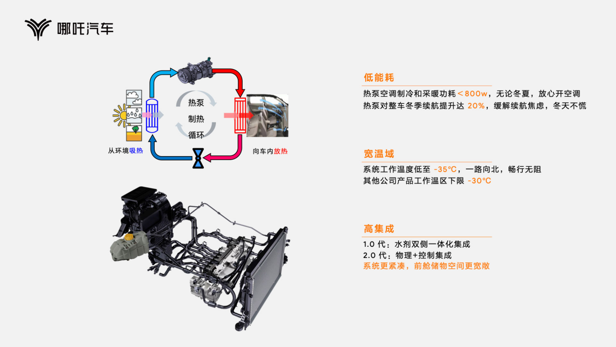 · 低能耗:热泵空调制冷和采暖功耗<800w,对整车冬季续航提升达20%;