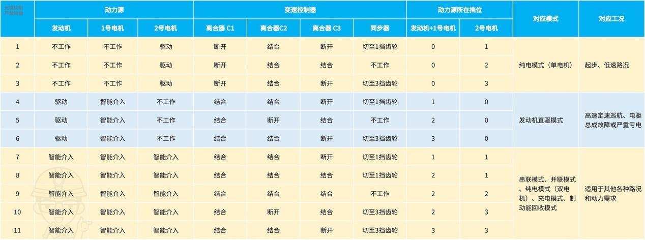 我们之前在混动百科里有解析过,这套混动系统的最大亮点在于3挡DHT带来的9模11速,即9种工作模式11个挡位输出。现在根据官方的更新资料,我们确认了「鲲鹏DHT」的『11速』分别是一下11个挡位: