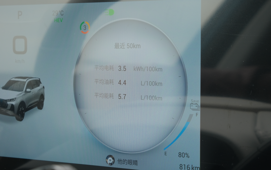 看原理有点绕,作为消费者,肯定只看结果,官方的亏电油耗为5.95L/100km,不过凡事得自己试一试,我们试驾了一段路程高速和城市道路的比例在6:4的路段,满电出发,负载3人加后备厢的拍摄设备。