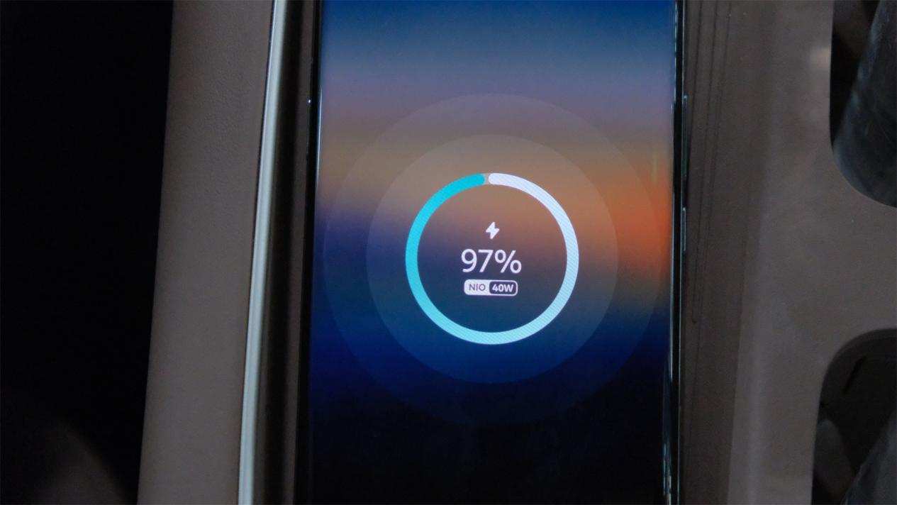 上车后,我们还发现一个小细节,当我们把手机放置在中控台的无线充电台上,便可进入40W的无线充电,同时屏幕上能看到NIO 40W的定制图标字样,无处不『蔚来』。
