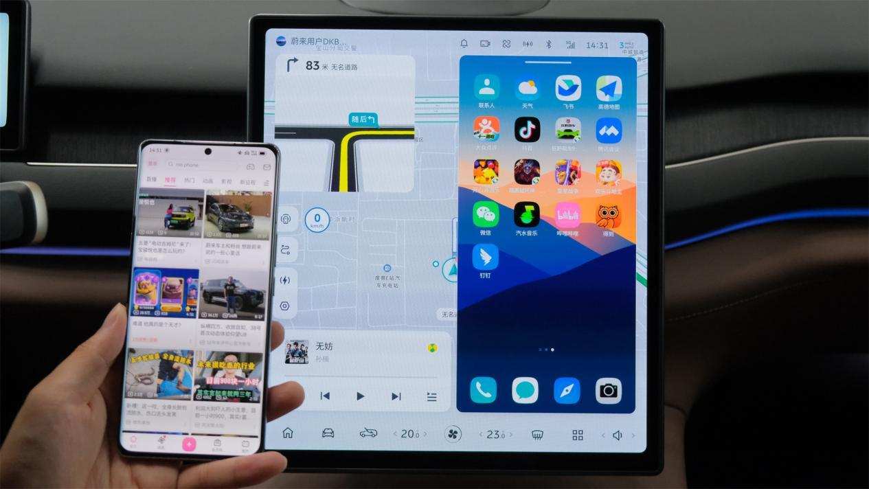 重点来了!和很多人以为的NIO Phone的车手互联只是投屏,事实并非如此。我们进入「天空视窗」互联后,车机端和手机端可以独自进行完全不相干的操作,可以将其视作一个独立的分身系统,比如车机端用来放视频,手机便用来回微信,两不耽误,这一点和很多车手互联的纯投屏是不一样的。