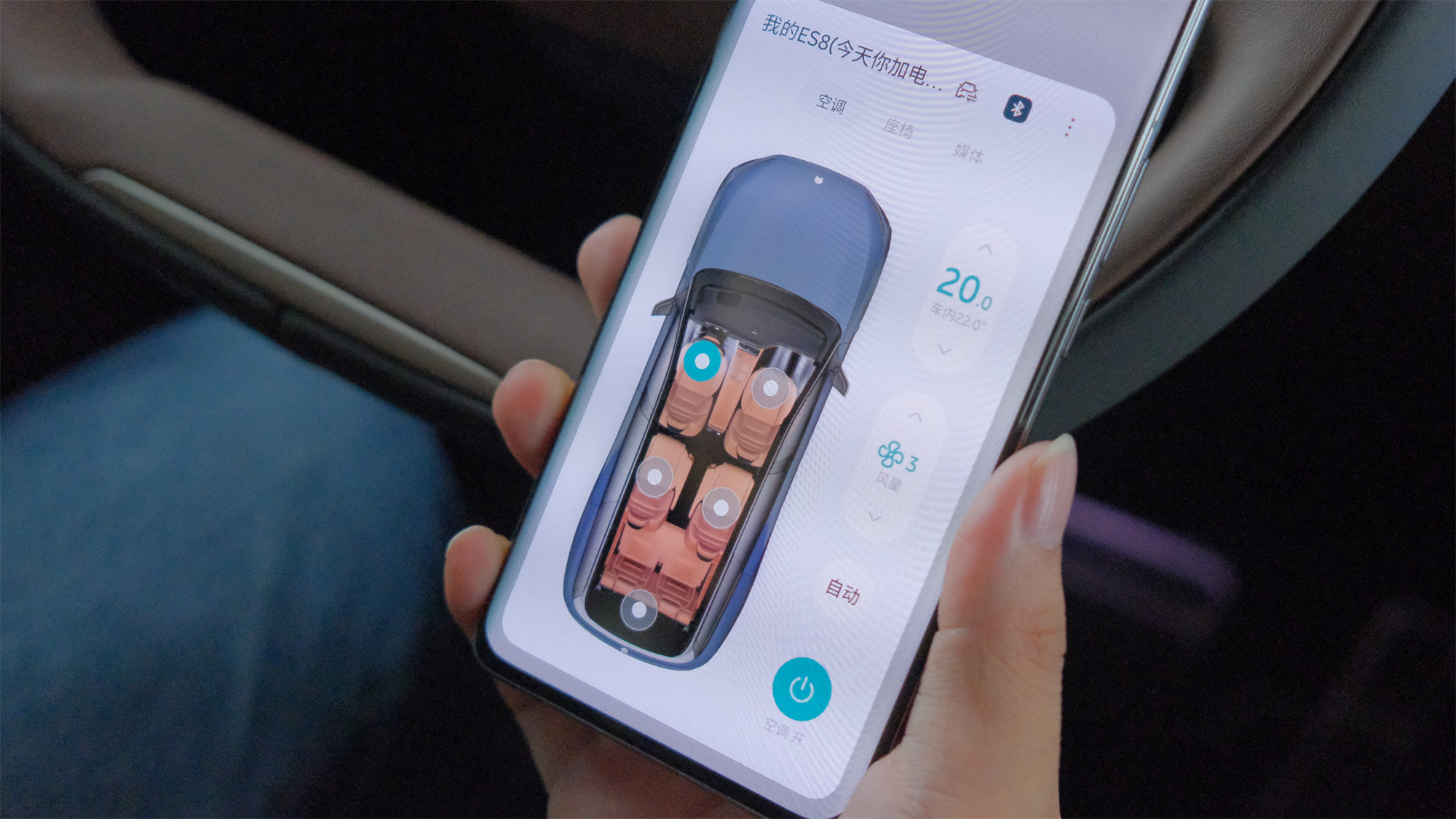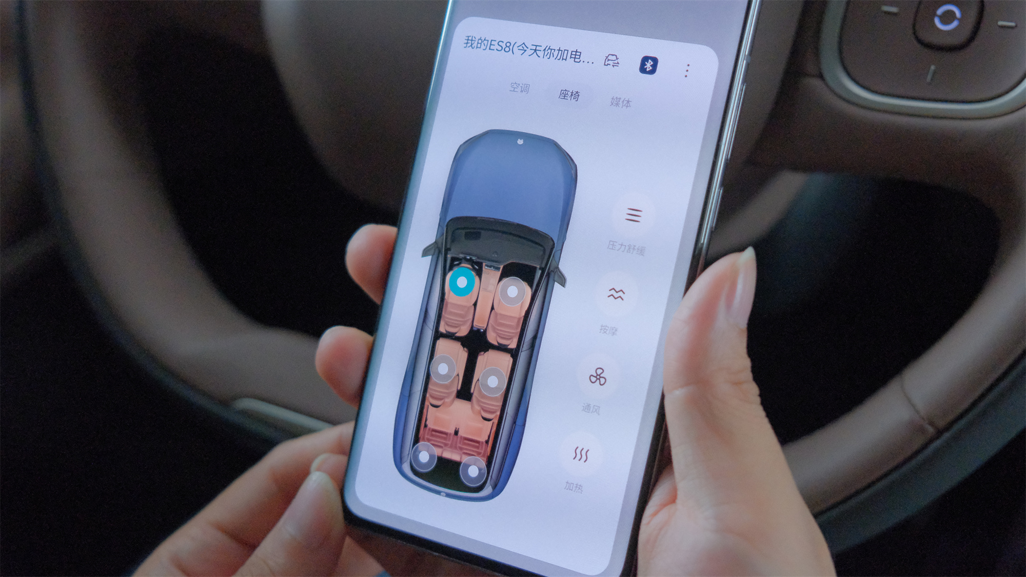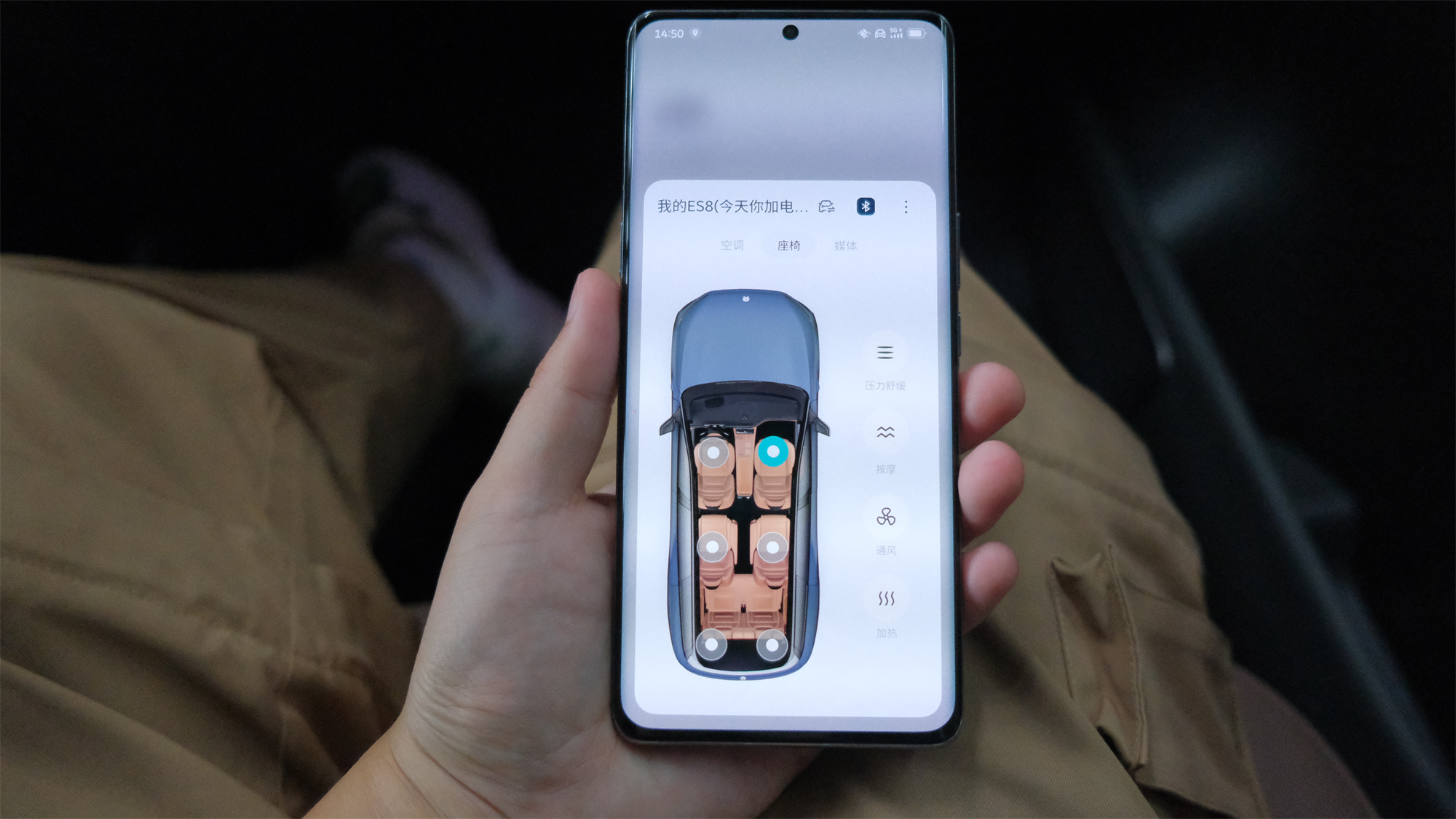 除了和中控屏的互动,NIO Phone还是一台移动车控器。它会智能识别手机在车内所处的方位,并在NIO Link车控键中,实现对空调、座位、娱乐系统的控制。