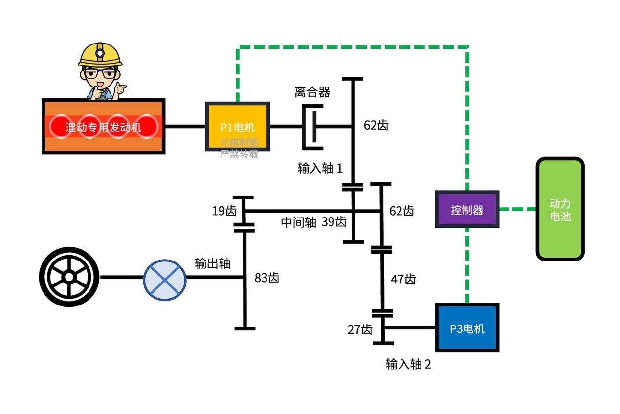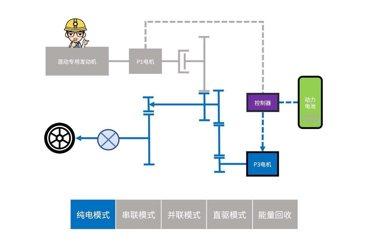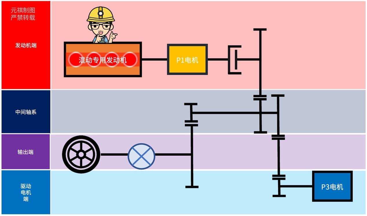 「动力电池」为「P3电机」(驱动电机)提供电能,转化为机械功率后从「输入轴2」直接到达「中间轴」,最终到达轮端。