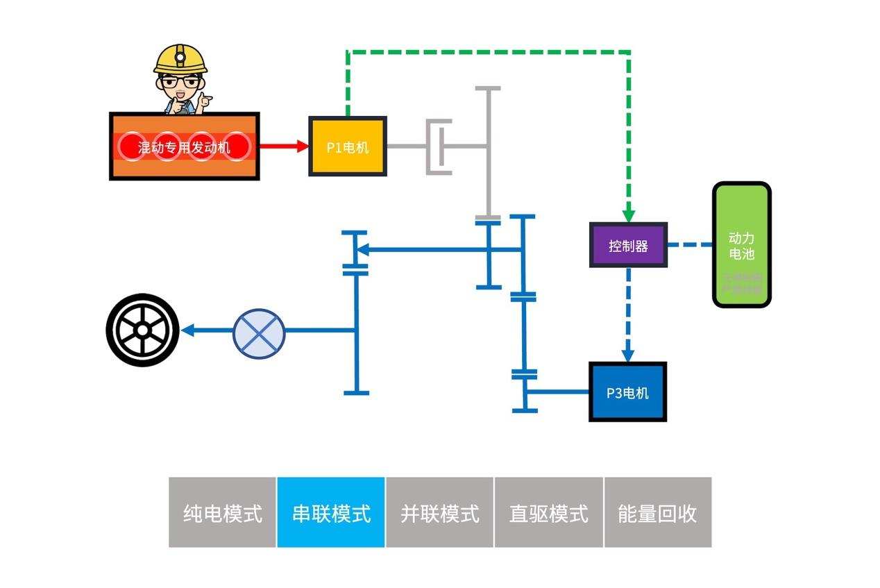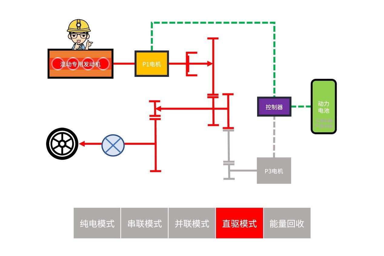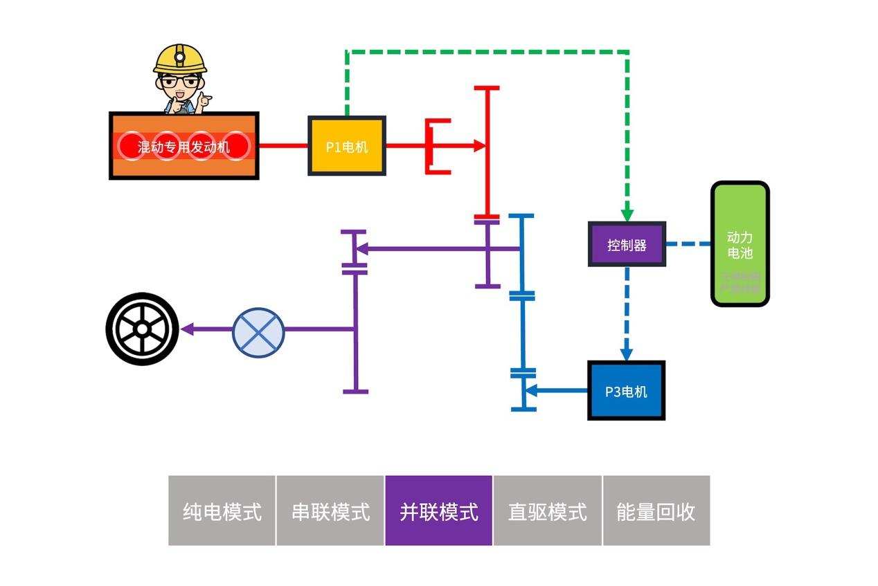 此时,前方出现了一辆速度较慢的货车,我想在高速巡航的情况下,进一步提速,所以深踩加速踏板,系统则会检测到动力需求还在提升,并可能会让「发动机」脱离最佳的工作区域,故此,系统会让「电池」给「P3电机」供电,进入全动力源输出的全负荷(并联)模式。