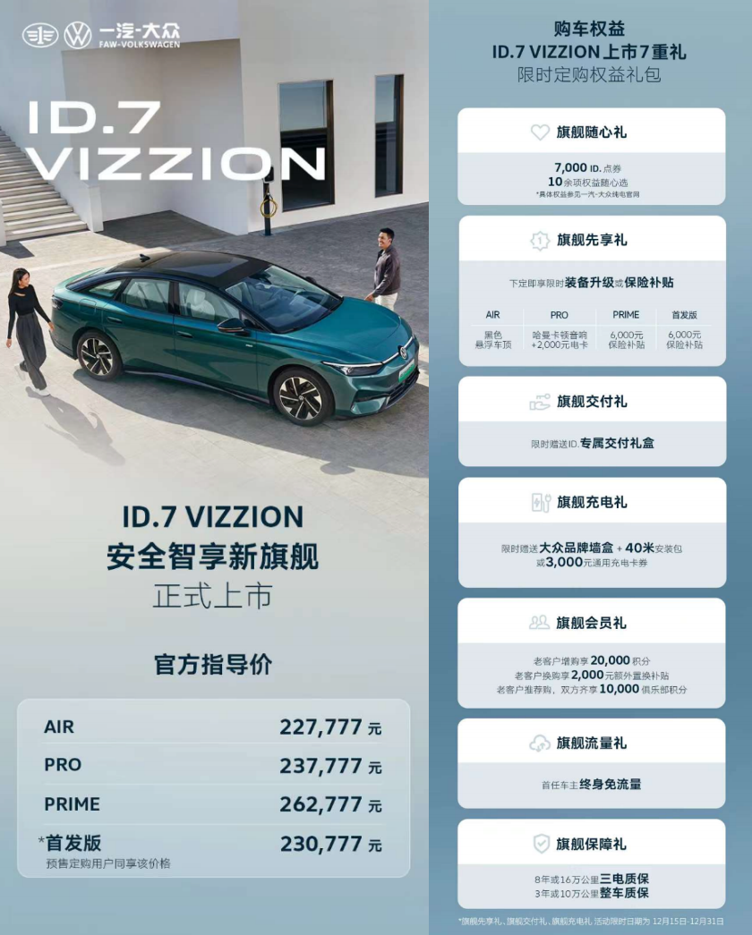 在万众期待下,ID.7 VIZZION终于在2023年内完成上市,共推出AIR版、PRO版、PRIME版、首发版四款车型,价格在22.77-26.27万元之间,起步价格下探至22万元,比之前的预售下调了1万元,并推出了总价值2万左右的7重购车大礼。整体来说,一汽-大众对于ID.7 VIZZION的定价和权益政策可谓是诚意满满。