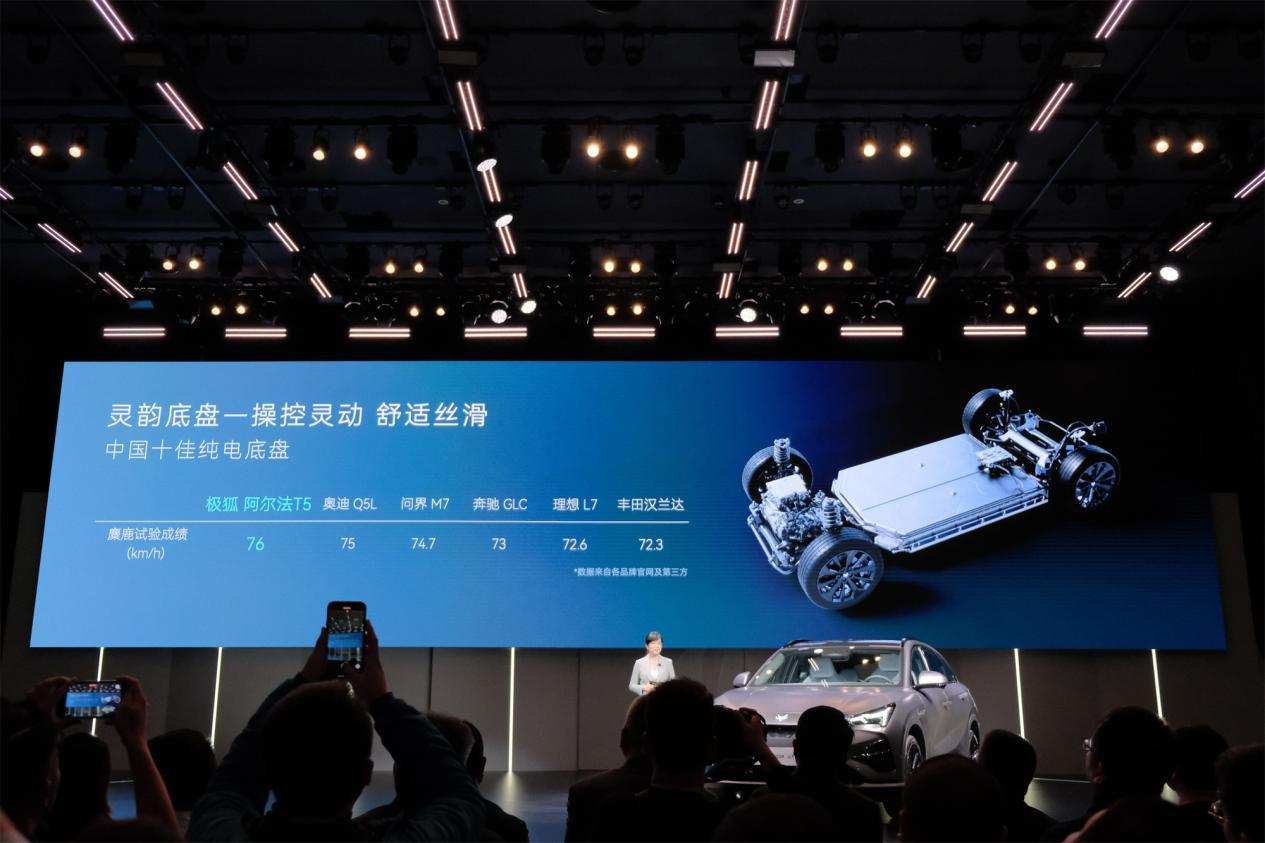 如果说健康,极狐已经做到了天花板。那么安全,也是极狐家族基因。阿尔法T5的高强度钢和铝合金车身占比高达81.0%。在热成型钢比例上,行业平均水平是15%,以安全著称的沃尔沃XC40是20%,而阿尔法T5达到了30.08%,材料强度达到1500 MPa,车身抗扭刚度更是达到了天花板级的47119Nm/deg。