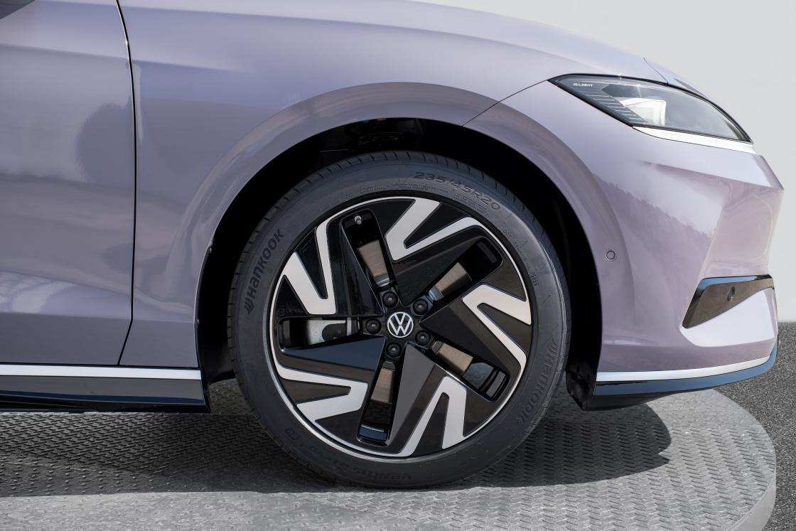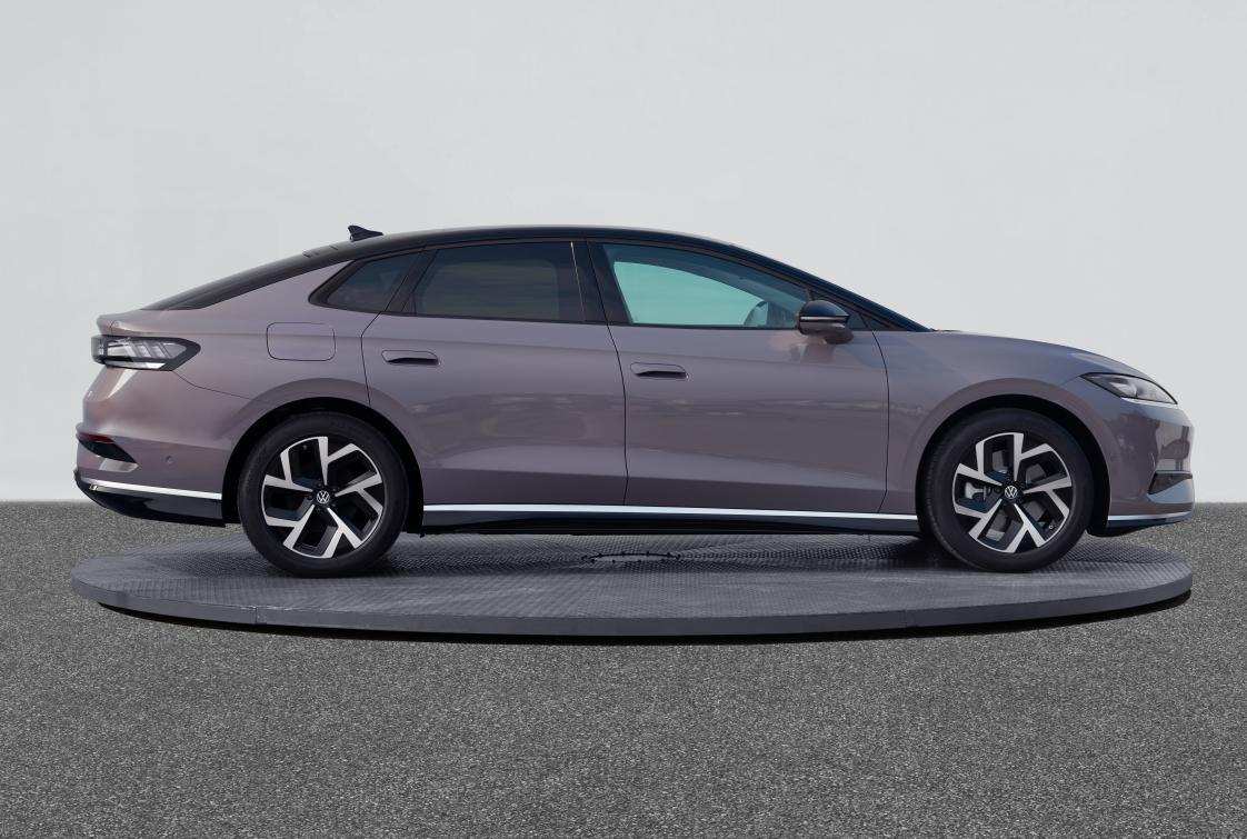 侧面设计上,ID.7 S展现了饱满的车身结构,立体曲面造型及双腰线的设计,让整车比例显得更加修长。半隐藏式的门把手,在兼顾实用性的同时,增加了流畅感。黑色悬浮式车顶配合溜背造型与上翘的尾翼,打造出动感轮廓。同时低风阻车身及轮毂设计,为ID.7 S带来了出色的空气动力学性能。