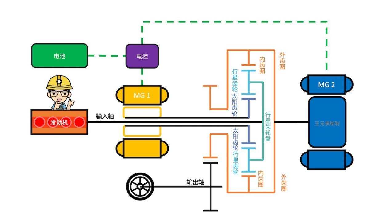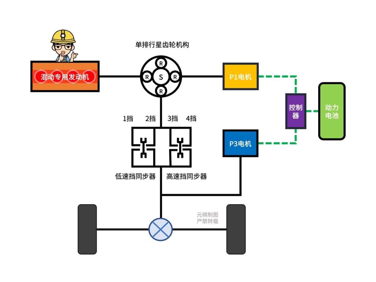 没有「机电耦合机构」:由于「行星齿轮机构」的加入,摒弃了「离合器」和「机电液压系统」等组件,整个变速过程是通过两个「电机」进行「发动机」、轴系端的转速调节,「同步器」进行机械啮合。