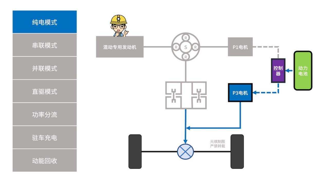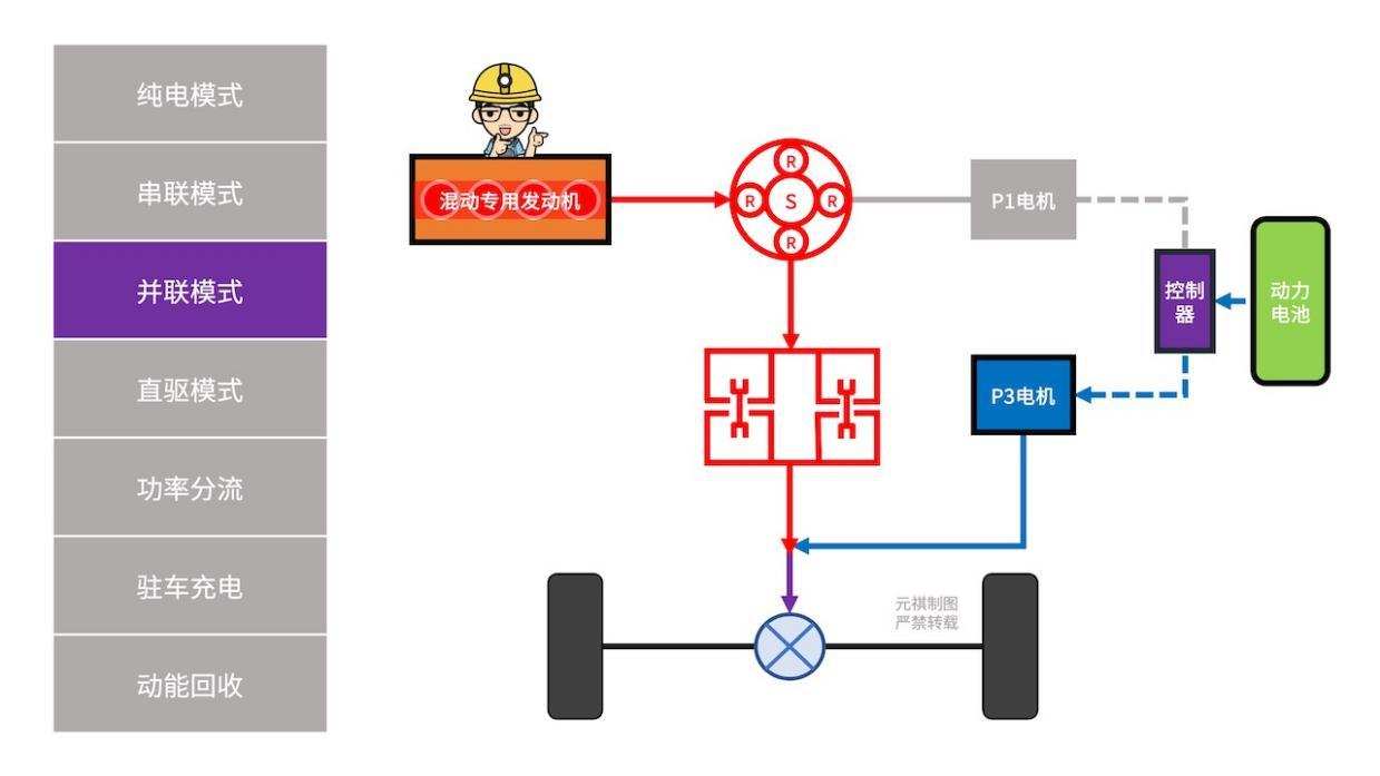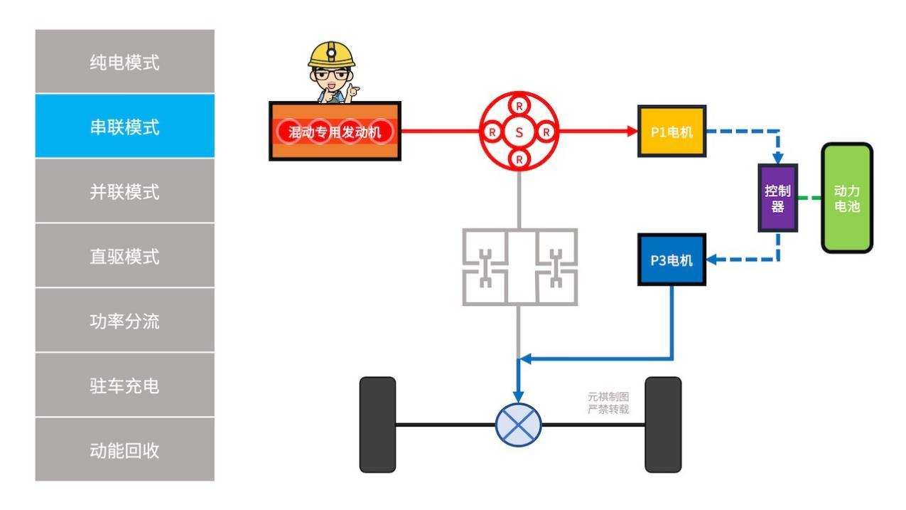 再要插一句,我以搭载「马赫DH-i」的PHEV车型为例,因为有「功率分流」加持的HEV车型,在低速时会更多地选择功率分流模式,而PHEV拥有更大的「动力电池」,纯电和串联的工况才会更多一些,故此,更适合我去解释更多的细分工况。