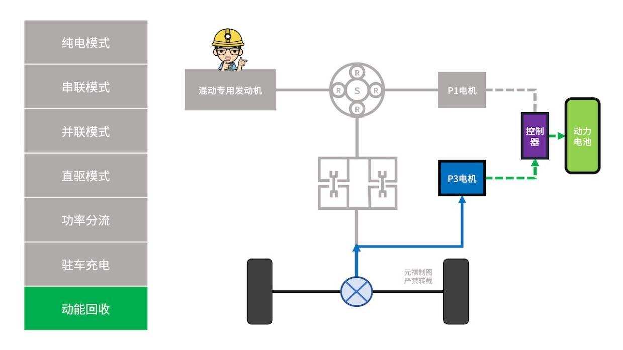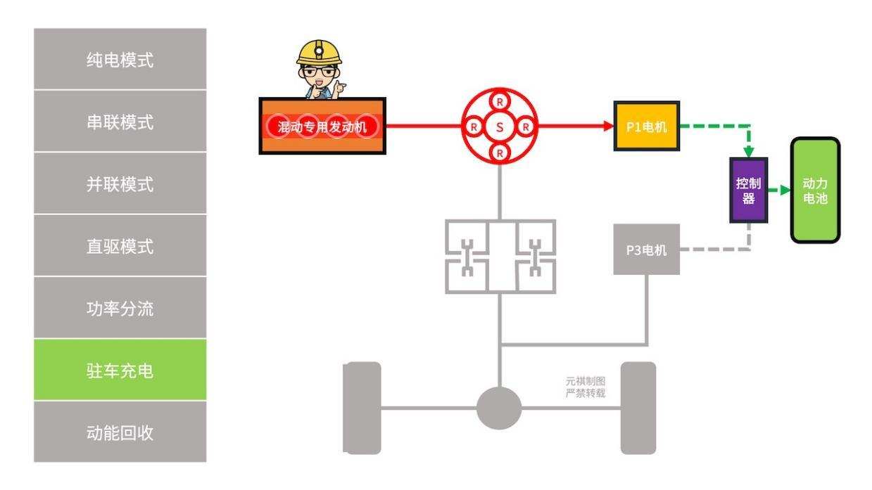 当我在城市中低速的道路行驶时,系统基本会让「P3电机」持续驱动车辆,当「动力电池」的SOC降低到一定阈值时,「发动机」便会启动,「发动机」的动力通过「行星齿轮机构」(个人理解是带动「太阳轮」)带动「P1电机」进行发电,为「P3电机」补充供电。