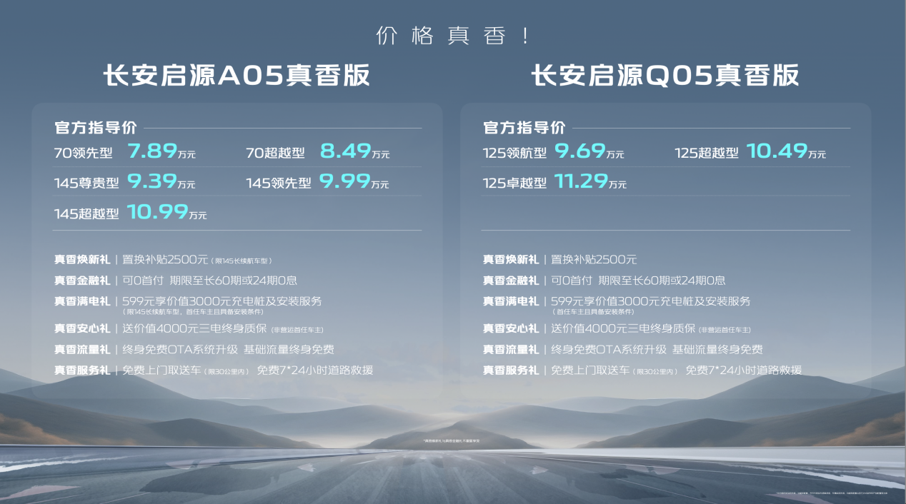 4月12日,长安启源A05真香版/Q05真香版正式上市,两款车型版本中的数字代表了CLTC纯电续航里程,其中A05真香版包含70/145km两种续航版本,共推出5款车型,指导价为7.89-10.99万元;Q05真香版共推出3款车型,CLTC续航一致为125km,指导价为9.69-11.29万元。