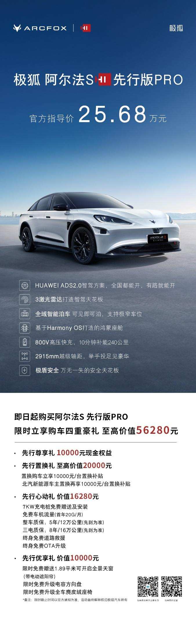 4月25日,极狐阿尔法S先行版PRO在北京车展上正式上市,售价25.68万。与此同时,官方还公布了购车权益,推出了四重豪礼,综合优惠近56280元,其中现金优惠1万元,这意味着只需24.68万元即可拥有高阶智能豪华纯电轿车,更有置换车主享最高20000元优惠,最低可达22.68万。相较市面上其他带激光雷达的车型基本都在26万以上,这款车可以称之为 “最具产品竞争力的高阶智驾产品”。