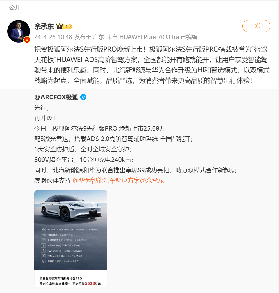 同时车展余承东发文官宣极狐汽车升级为首个也是唯一与华为同时拥有智选及HI双模式合作的车企,双方合作持续进一步深入,也为阿尔法S先行版PRO智驾能力再升级奠定了强有力的基础。