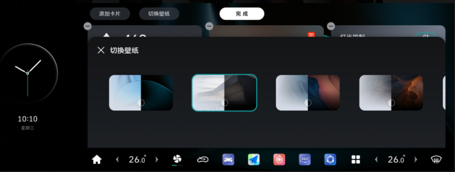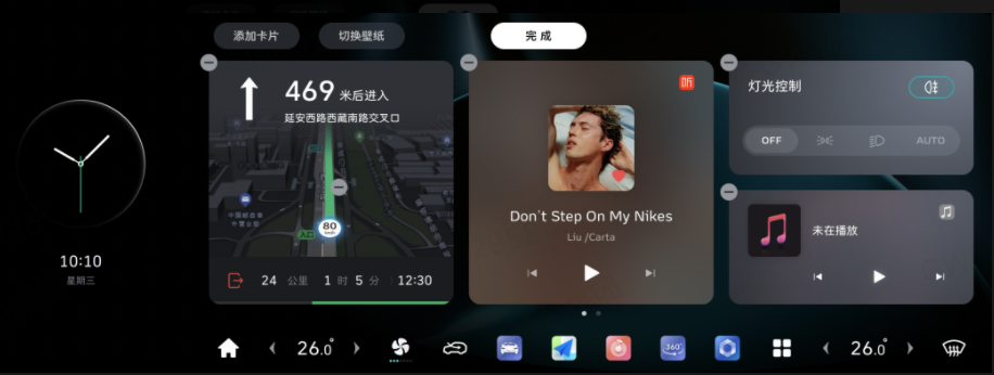 新系统的屏显升级为卡片式桌面,用户可以根据个人喜好更换全新的主题壁纸,还可以通过DOCK功能自定义主界面图标。在强光环境使用车机时,新增的“白天模式”能够带来更舒适的体验。