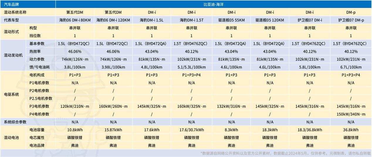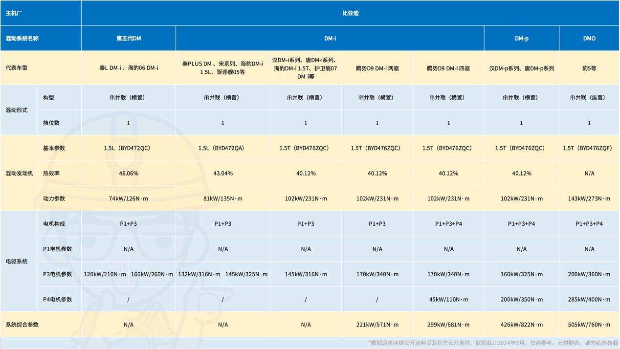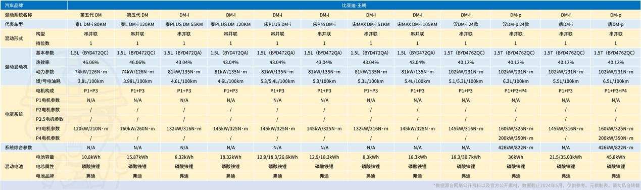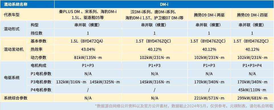 在统计了截止2024年5月比亚迪旗下各个品牌在售车型后,先把个人总结的结论放在最前:一共有四款DM系统,分别是第五代DM、DM-i、DM-p和DMO。