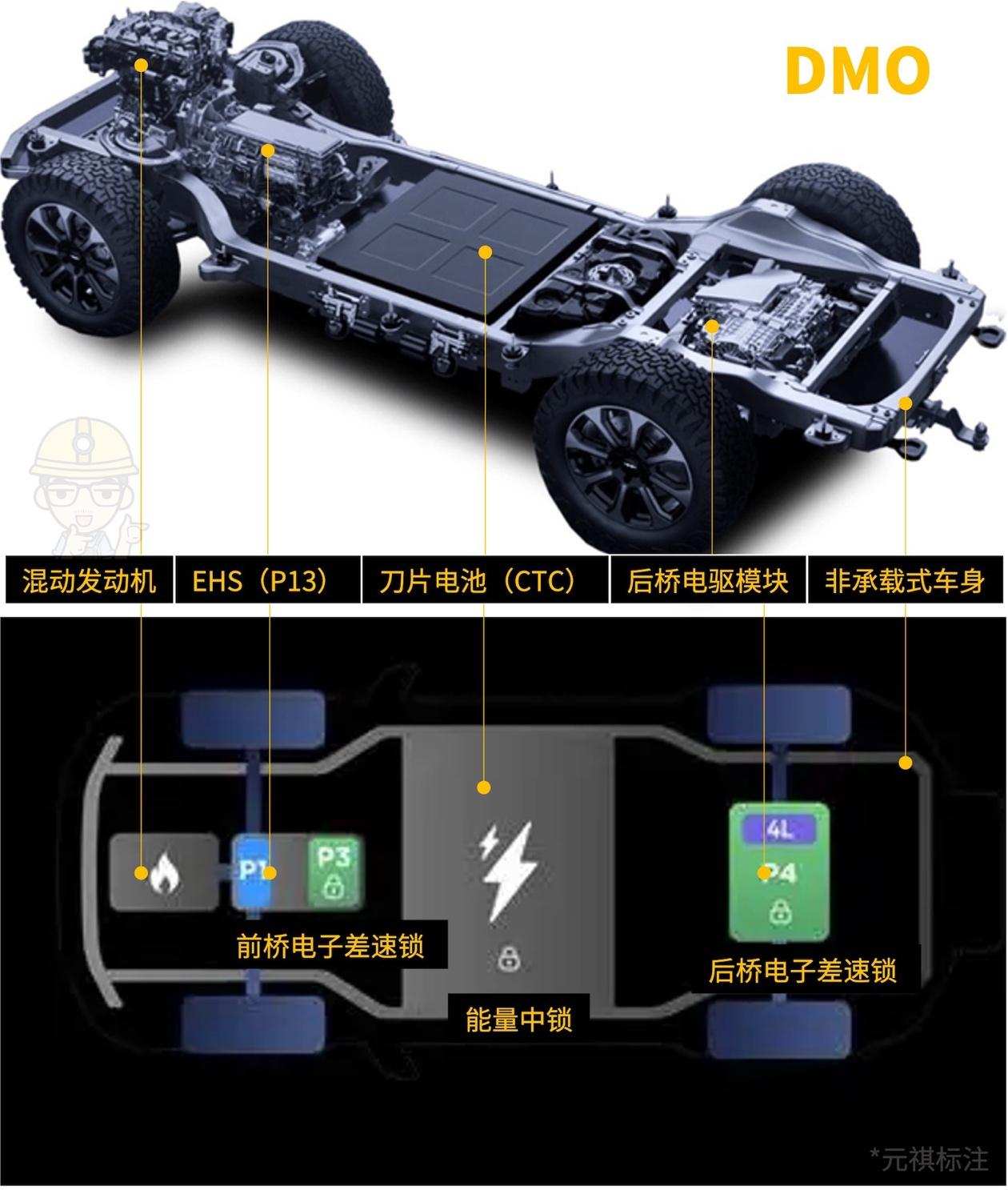 非承载式车身:之所以再写一遍,是因为DMO作为混动的越野平台与燃油车有着一定的区别,比如说电池的布置,DMO选择了CTC电池设计,将刀片电池构成的电池包与大梁相结合,在增加空间利用率的同时,也能提升扭转刚度。更有趣的是,动力电池正好也是一个『配重块』,这点也是燃油时代所没有的特点;