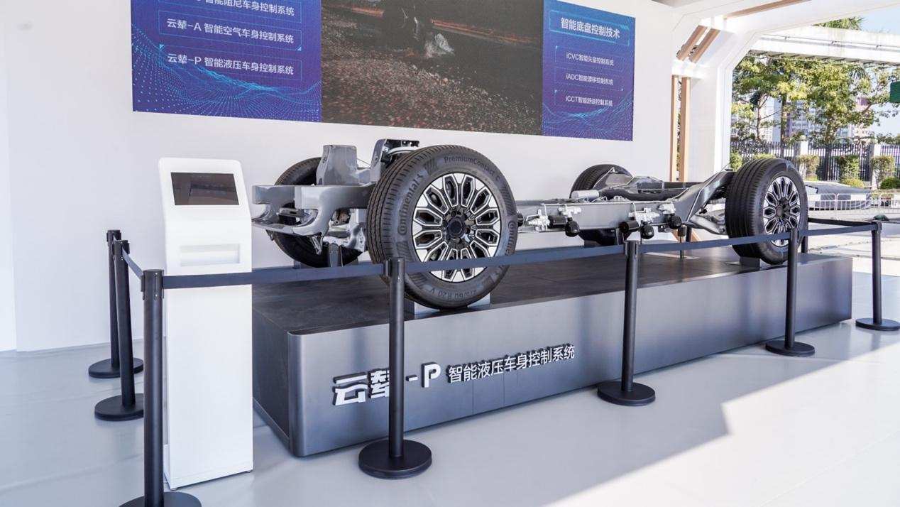 带云辇的底盘:为了体现越野,底盘和悬挂也必须做出改变,DMO采用前后双叉臂独立悬挂的设计,从实物模型可以看出,前桥留给动力总成的位置并不大,我们下一点来聊。而后桥则是利用了电机体积较小的优势,可以让左右悬挂安全独立,相比传统越野车硬轴式后桥,双叉臂拥有了更长的行程。更重要的是DMO配上了当时刚发布不久的云辇-P智能液压车身控制系统,实属一大亮点;