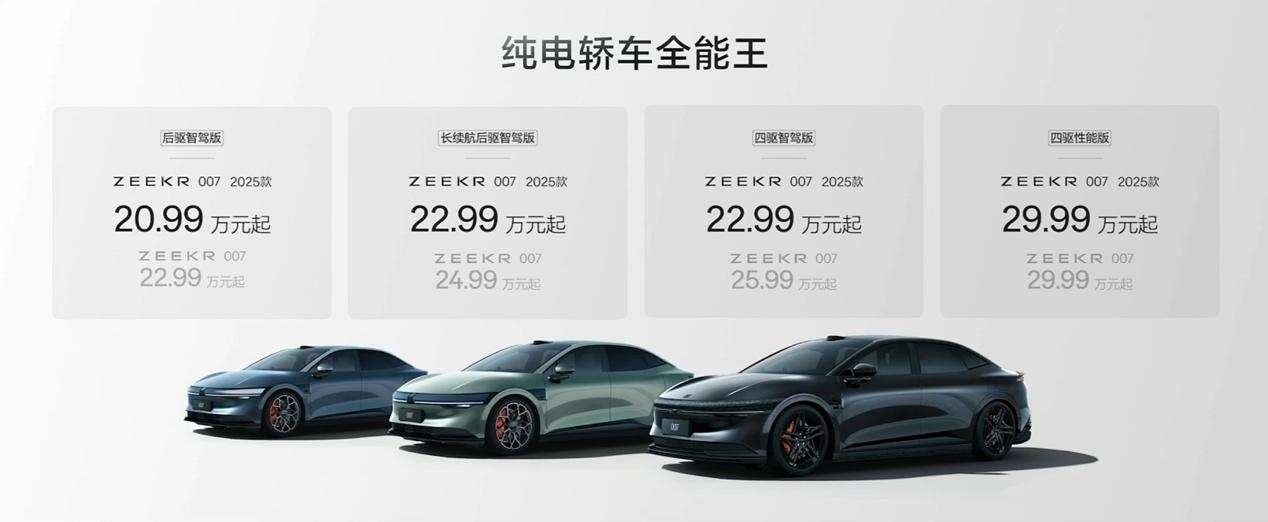 没有前摇,我们先来看新款车型的价格和权益。首先是诚意满满的2025款极氪007,价格从20.99万元起至29.99万元,其中四驱智驾版的价格尤为有诚意,只需22.99万元起。