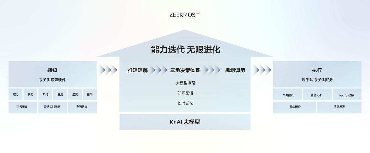 发布会上,极氪智能座舱负责人姜军宣布极氪AI OS在行业率先实现了智能座舱的端到端,在感知、决策、执行各个环节实现了底层能力的进化与融合。极氪AI OS通过调用遍布座舱内外的传感器,实现了听觉、视觉、时间、位置等多维度的主动感知能力,凭借「大语言模型」和「视觉语言模型」,它可以像人类一样,更精准的理解各种场景和需求,再通过端到端AI决策引擎的「大模型推理」、「知识图谱」和「长时记忆」等能力,迅速形成基于用户习惯和场景的主动最优解,最终通过调用1000多种原子化服务,满足无限功能场景。