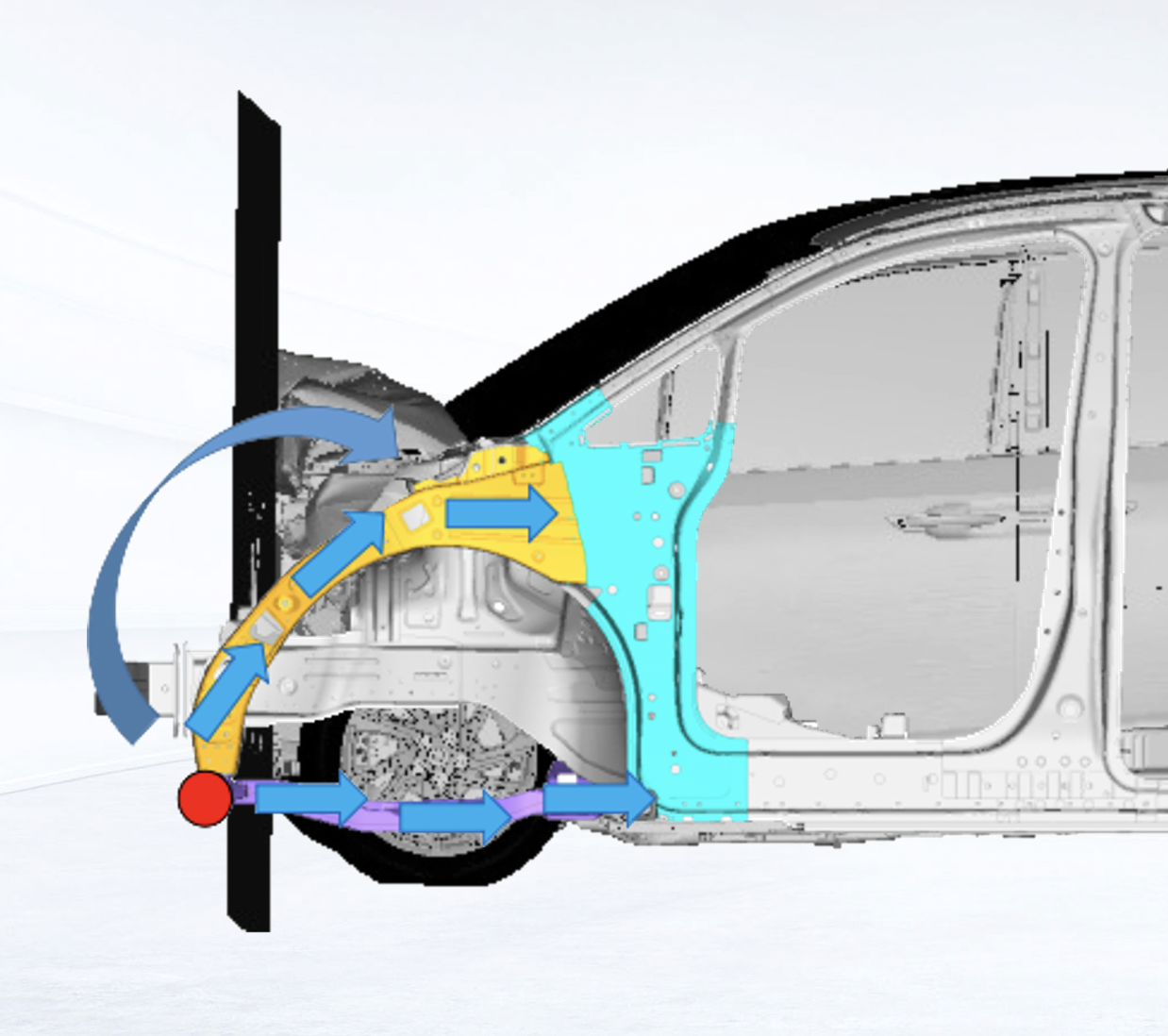 此外,前舱车身还首次采用了『折扇变形式』闭环结构设计,即是梁结构与副车架稳定连接,通过与副车架刚度匹配实现压溃的同时伴随旋转,在碰撞过程中,可以让梁往上弯折,整个打开的角度往上弯曲,保证始终纵梁最大的截面正对前方,诱导前纵梁稳定压溃,规避击穿壁障风险。