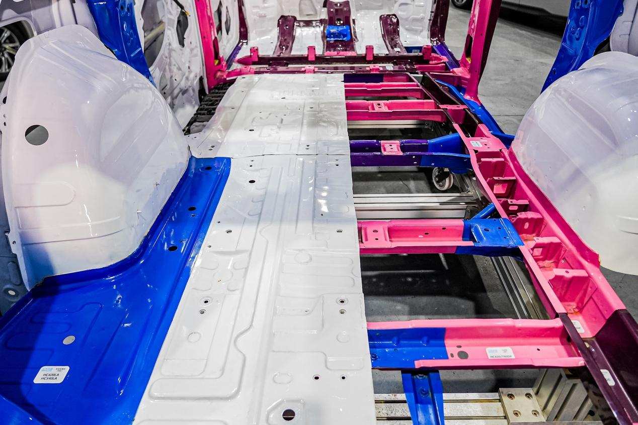 车头的防撞部位进行了π结构的负荷设计,即是采用超宽前防撞梁(覆盖面积超70%车宽)搭配纵梁及扭力盒形成π字型载荷传递路径。从细节上可以看出,纵梁并非笔直,而是被设计成了弯曲的状态,而且每个曲率和凸的截面,都有特殊的力学设计,这样的设计可以高效地将碰撞载荷转移至门槛,极大程度的阻止动力电池受到冲击,提升高压电安全保护性能。