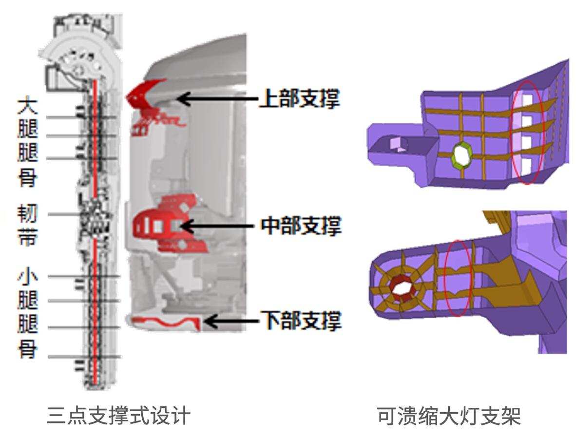 比如在汽车前唇位置的设计,我们会发现许多缺口,在这些位置上,设置了前保险杠的上饰板、行保膝部专用吸能件、小腿专用支撑件,这些组件都可以在碰撞中,为行人提供合理的腿部支撑。此外,大灯等硬点零件也采用可溃缩支架设计,进一步降低碰撞伤害。