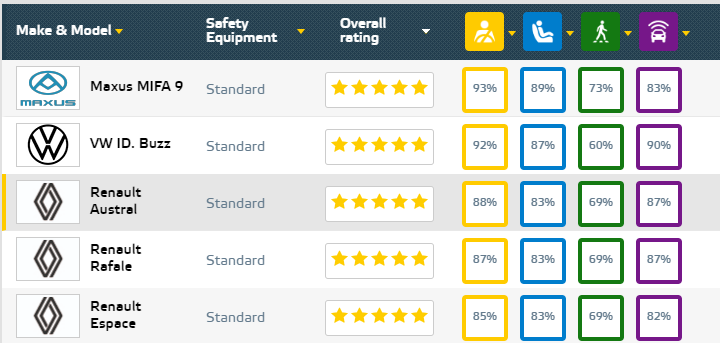 不过,这显然没有难住上汽大通。据悉,目前C-NCAP总共有4款MPV获得五星成绩,其中上汽大通的G90而且得分是第一。而Euro NCAP总共有14款车获得五星成绩,其中MPV车型有两款自主品牌,一款是上汽大通的产品。而目前同时拥有Euro NCAP和ANCAP双五星安全的MPV,唯有上汽大通的大家9。