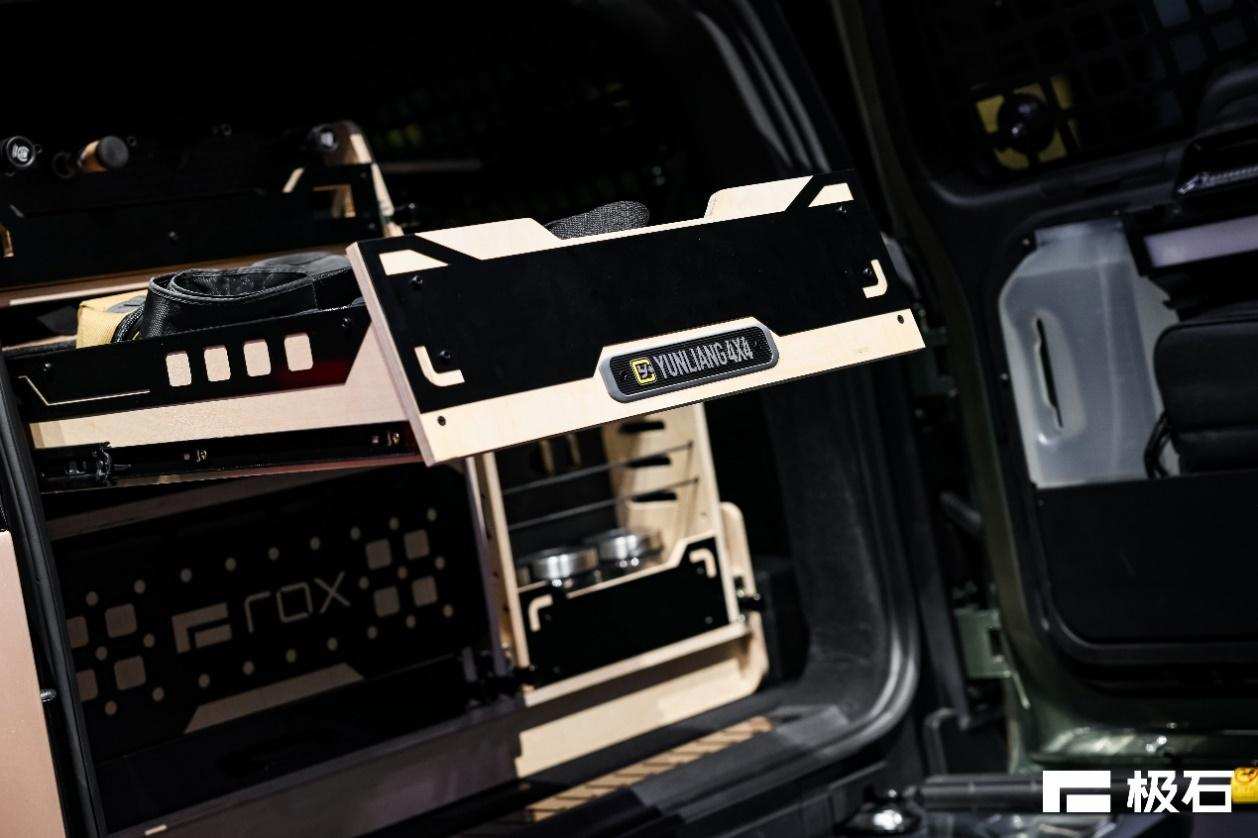 钓鱼大师版改装套件由极石汽车携手国内越野改装专家——运良越野共创,采用"Camping Loft"设计理念,由车顶帐、侧边天幕、尾门厨房系统、淋浴帐及加压水箱、魔盒套件组成。业界首创的钓鱼魔盒套件以露营IGT模块为灵感,拥有多达12处收纳 空间,能够合理存放鱼竿、鱼轮、鱼饵、鱼线等各类渔具,结合专属的车顶帐、L型侧边天幕、尾门厨房系统等拓展套件,创造出一个灵活百变的户外钓鱼工作站,解锁“极石出发,因渔而生”的渔趣体验。