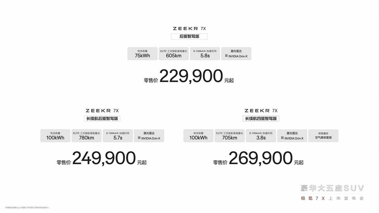 9月20日,极氪智能科技旗下豪华大五座SUV极氪7X正式上市,包括后驱智驾版、长续航后驱智驾版和长续航四驱智驾版三个版型,官方零售价为22.99万元、24.99万元和26.99万元,并于同期开启全国交付。即日起,用户可通过极氪App、极氪官网、全国各大城市的极氪门店等官方渠道进行订购。