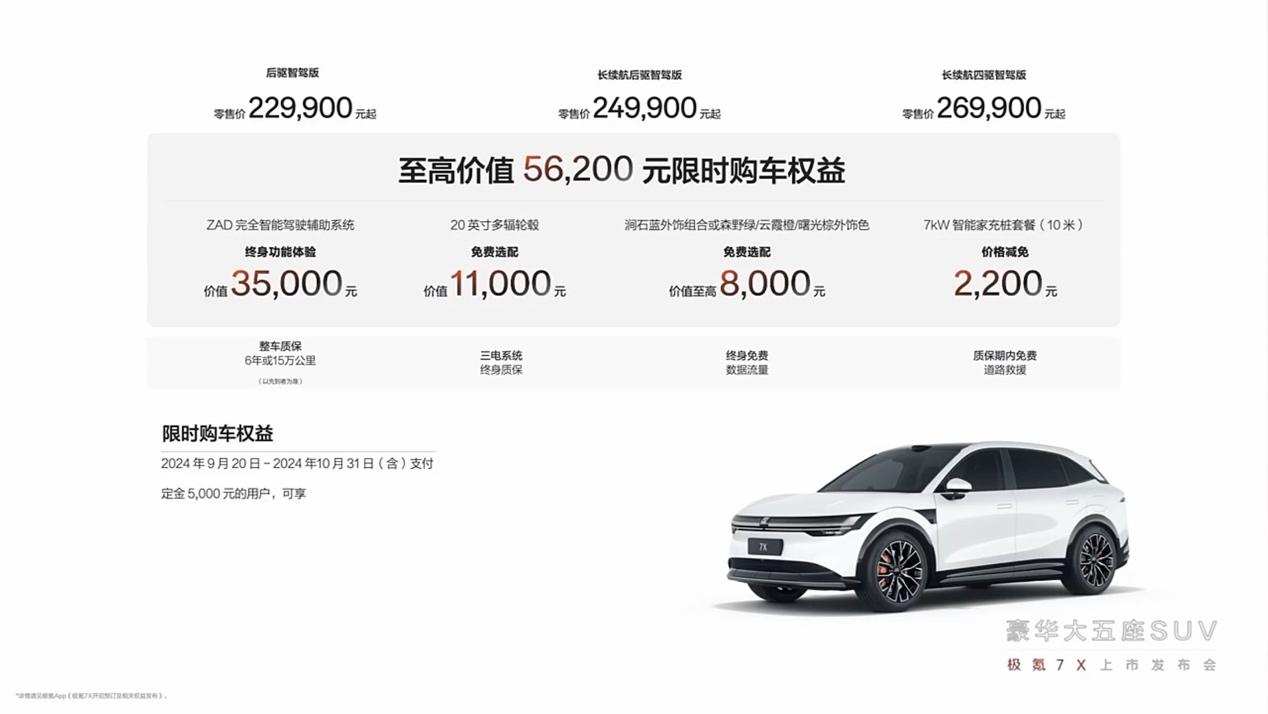 而权益方面,2024年9月20日到2024年10月31日(含),所有支付5000元定金的用户,可享至高价值超过5.6万元的限时购车权益,包括:价值3.5万元的ZAD完全智能驾驶辅助系统终身功能体验;可免费选配价值1.1万元的20英寸多辐轮毂;可免费选配价值至高8000元的涧石蓝外饰组合或者森野绿、云霞橙、曙光棕的外饰色;可减免2200元的7kW智能家充桩套餐(10米)。同时,极氪新车首任车主下定首台极氪7X,可享价值1.5万元的增换购权益,该权益自极氪7X上市起三年有效。