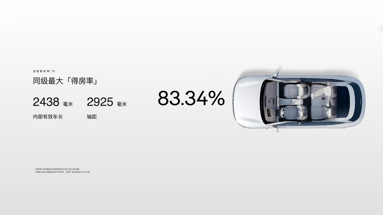 所以,在设计上回归了用户对SUV的根本需求——大空间。基于浩瀚架构的极氪7X以4825mm的车长和2925mm超长轴距,通过短前悬的布局优势,使得有效得房率超过83%。此外,车内有效头部空间可达1021mm,后排最大腿部空间可达1187mm。同时全车拥有32处储物空间、62L电控前备厢和616L超大后备厢。