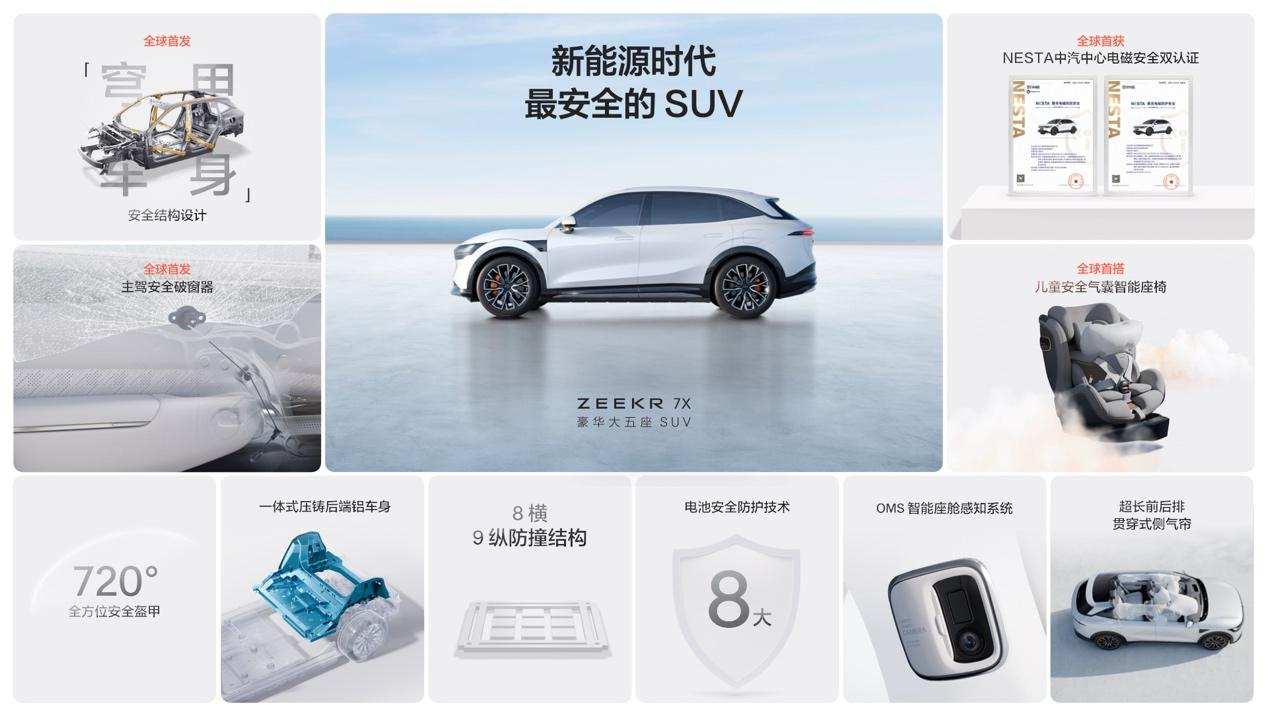 被动安全方面,极氪7X借鉴赛车的安全设计理念,采用了「穹甲车身」的安全结构设计。据悉其最大创新,就是采用了2000兆帕超长一体成型热气胀钢柱,屈服强度是普通成型工艺的8倍。