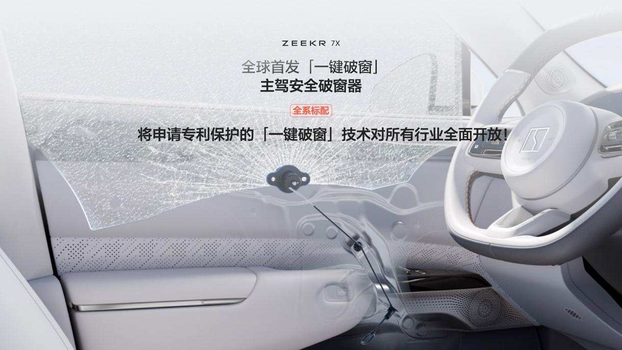 在安全细节方面,极氪7X将首次采用一键破窗功能,即是当车辆发生意外,车主又无法使用破窗工具脱困时,那就只要拉下位于主驾车门内侧的破窗按键,那么安全破窗器便可为车主破窗。当然,儿童安全气囊以及在电磁安全方面的认证,都是极氪7X在全面安全的细思,可以说『坦度』直接拉满。