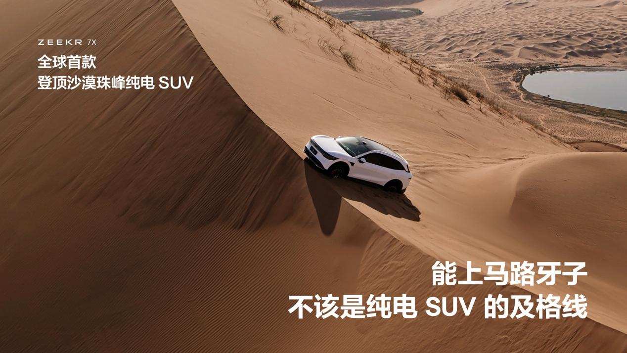 此外,配合精细标定的分布式牵引力控制系统和智能扭矩分配系统,将大大提升了整车的抓地力和通过性。在此前的试驾活动中我们发现,无论是交叉轴、S坡,还是45度的硬土爬坡,极氪7X皆可以轻松应对。而极氪官方为了进一步展现硬核性能,特意将极氪7X开往了『沙漠珠峰』进行了摸底测试。总体来看,极氪7X将是一辆泛用性较强的SUV。