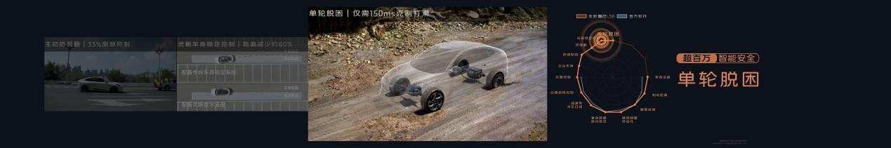 当车辆陷入泥泞等复杂地形时,双电机EVD矢量四驱系统驱动方案,仅需300毫秒就可完成后驱/四驱切换,是全球同类驱动平台的最快切换速度,能在短时间内精准控制打滑,帮助车辆轻松脱困。