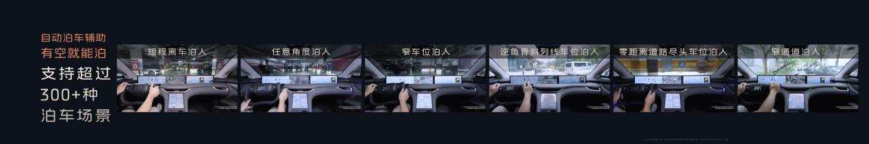 自动泊车辅助覆盖300多种泊车场景,支持任意角度泊入、窄车位泊入、逆鱼骨斜列线车位泊入、零距离道路尽头泊入、窄通道泊入。