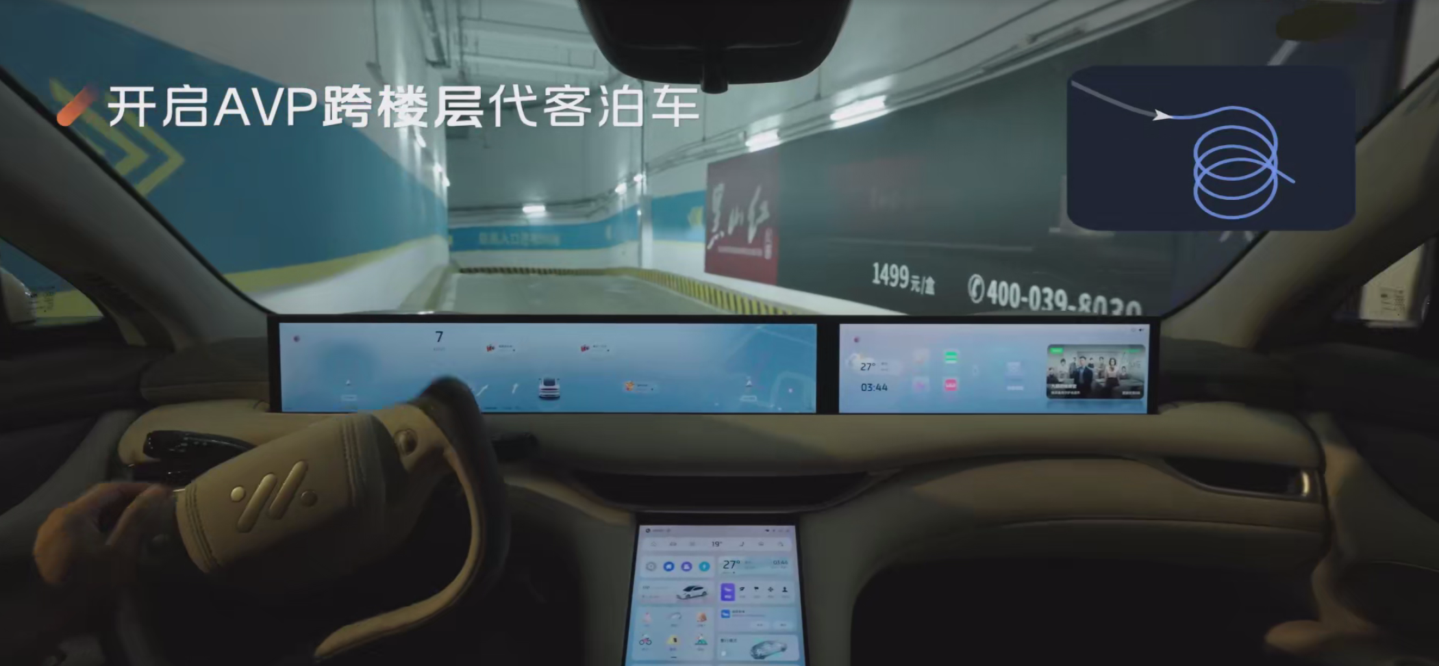 车辆还支持一键代客泊车功能,在任意小区或商场的地下停车场,进入停车场后,无需用户操作,绕停车场行驶一次即可自动静默建图,车辆可以自动自主导航、自动规划路线、自动实现跨层巡航、自动规避停车场车辆和行人,自动找到车位,完成自动泊车。