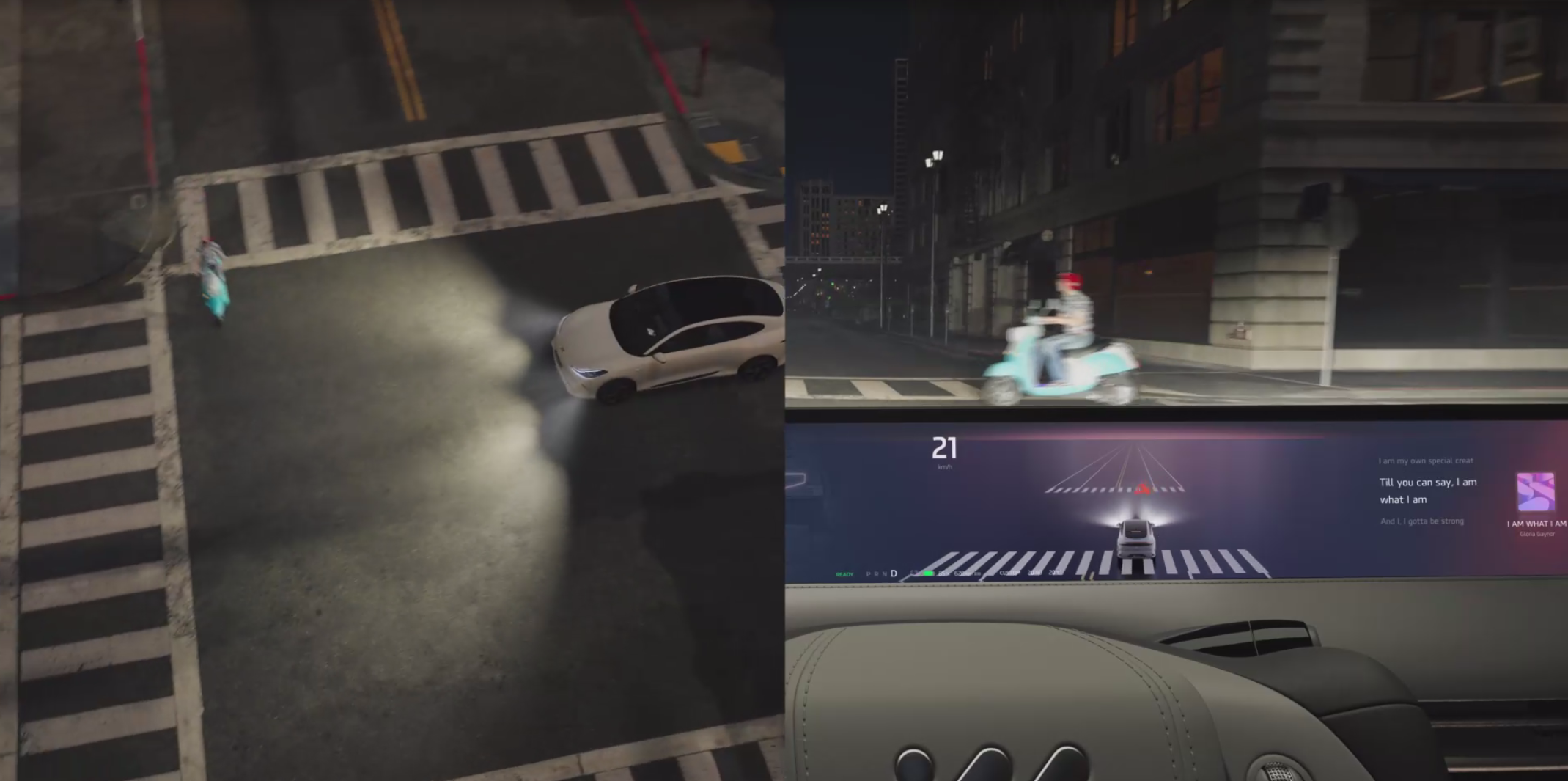 行驶在环境复杂的路口,总担心有行人/车辆从盲区窜出来,识别到类似路段时结合ADAS信号,如果有危险则触发对应侧角灯多次高频爆闪,用灯光提醒路人和驾驶员注意盲区安全。