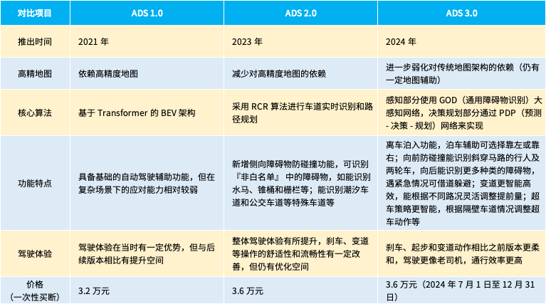 首先,我们将「华为ADS」作为华为从2021年至今的智驾系统统称,目前已经更新了3代。从功能表现来看,「华为ADS 1.0」作为开山之作,是依赖于高精地图的一套方案,搭载的车型并不多,我们不过多展开。而2023年发布的「华为ADS 2.0」相对于第一代,减少了对高精地图的依赖,采用轻量化地图,增强了对于非规则物体、异常天气感知和近距离切入等场景的适应性。