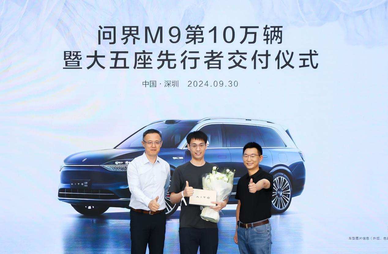 9月30日,问界M9第10万辆暨大五座先行者交付仪式在深圳隆重举行,多位问界M9大五座准车主受邀出席,现场感受这款“世界级好车”的产品魅力。华为终端智选车业务部总裁汪严旻、赛力斯汽车总裁何利扬莅临现场,共同见证了这一里程碑时刻,并为到场的车主交付了新车钥匙。