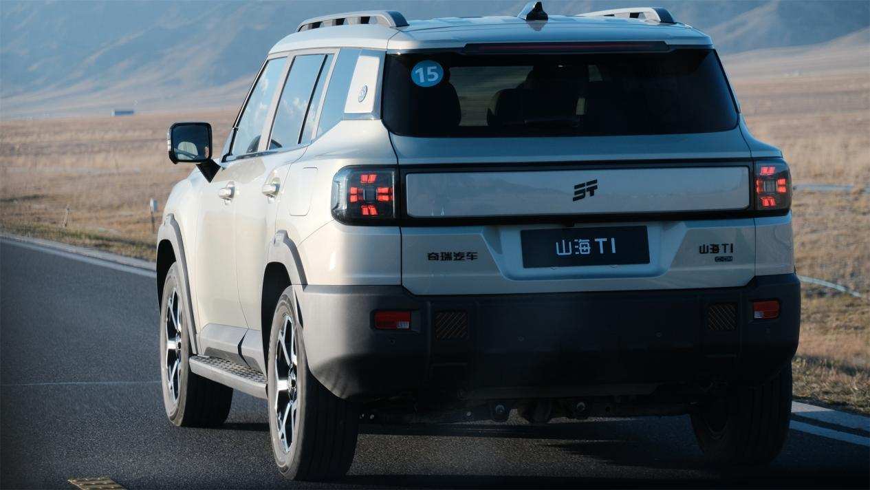 车身侧面,山海T1的线条简洁而富有力量感。A柱采用了隐形涂装设计,与车顶行李架和悬浮式车顶相得益彰,营造出一种时尚而动感的气息。山海T1的接近角为28°,离去角为29°,纵向通过角 19°,比公路SUV更加优秀。